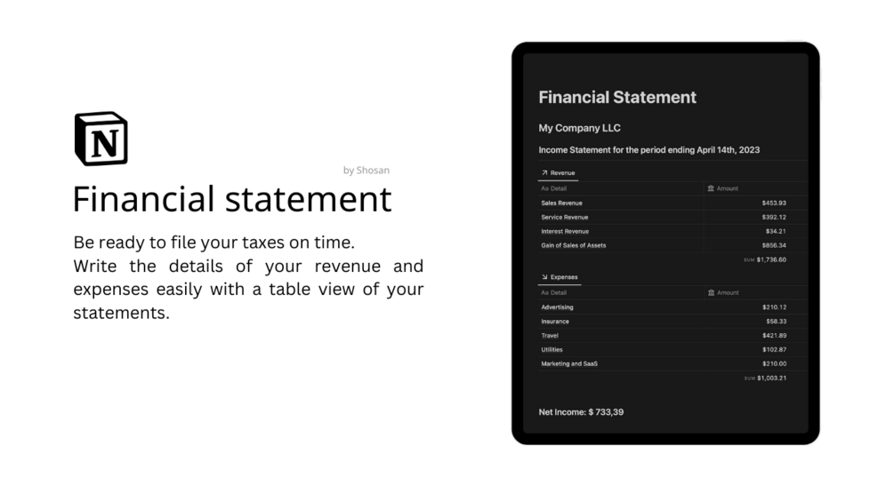 A financial statement template for you to detail your revenue and expenses to file your taxes. Get it quick, tax season is around the corner!